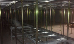Teräspalkit, erikokoiset C-profiilit, sekä vinojäykisteet jalustoihin, korkeuden ja kuormituksen mukaan.